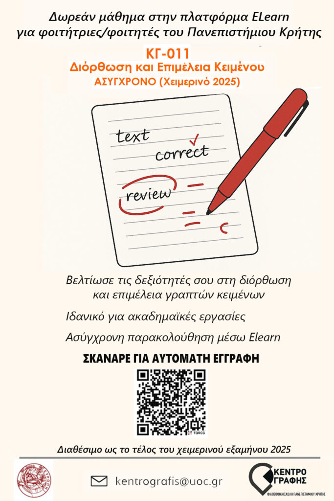 Διόρθωση και Επιμέλεια Κειμένου – Ασύγχρονο μάθημα μέσω Elearn By 28 Οκτωβρίου, 202528 Οκτωβρίου, 2025Ανακοινώσεις